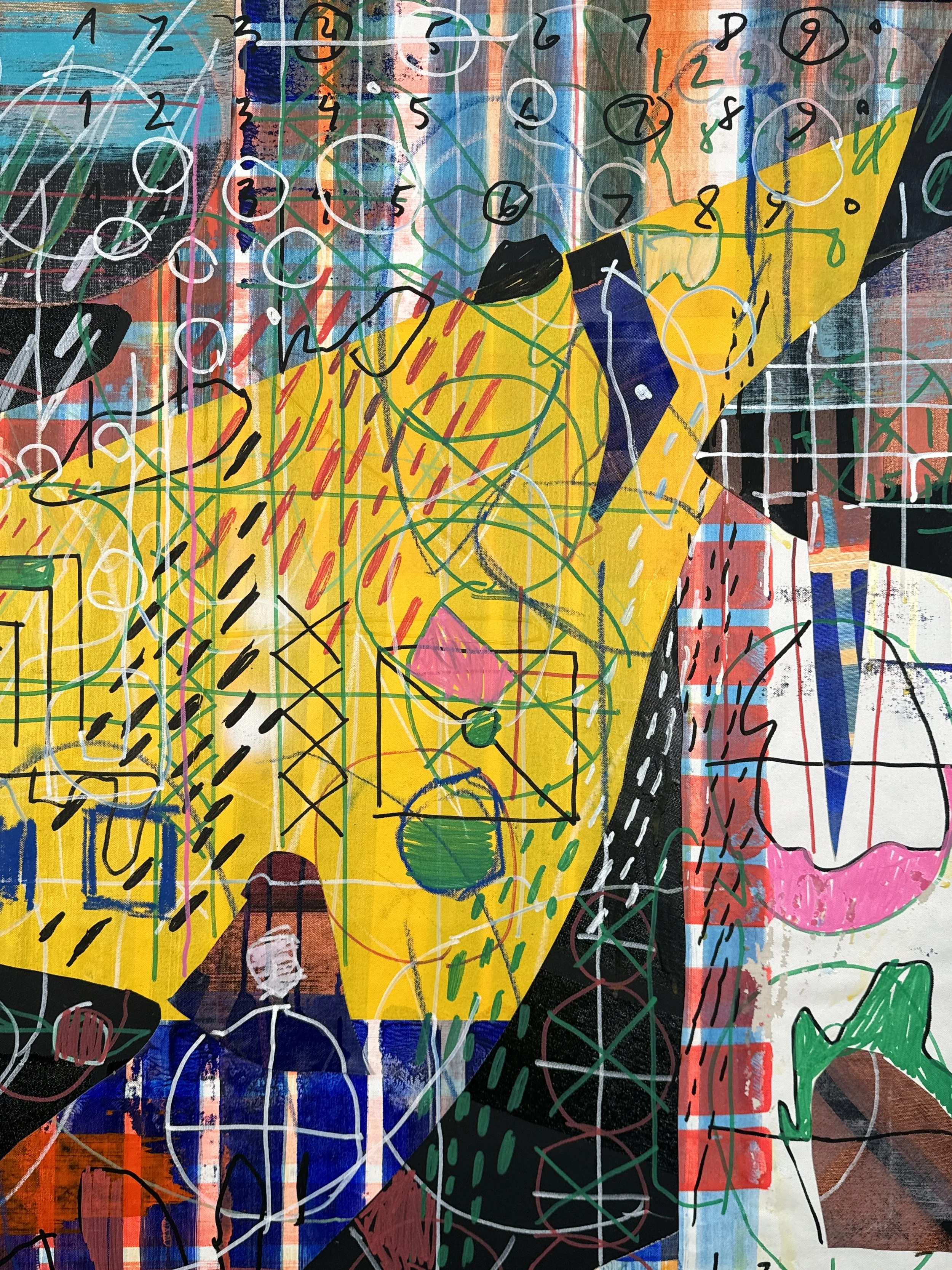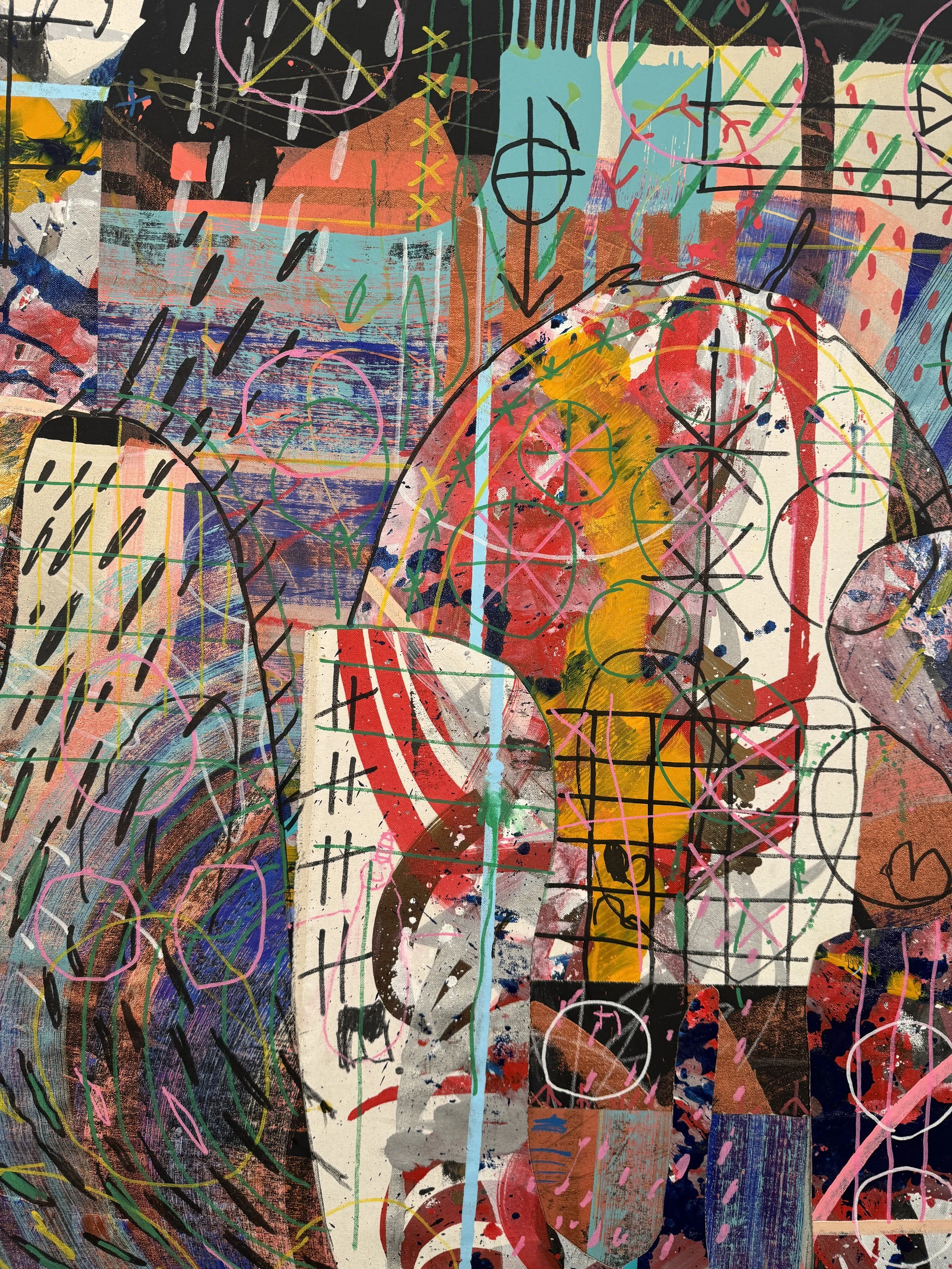 The Embellish series truly began three years ago — with fragments of old canvases and geometric pieces from my larger calligraphic works, stitched together on an industrial sewing machine. The results were fine, nothing extraordinary — but they opened a small window, a wrinkle in my process that I couldn’t stop thinking about. After creating those first five pieces, I set them aside and eventually forgot about them.